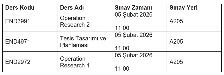 Endüstri Mühendisliği Bölümü dışındaki dersler ve servis derslerine ait sınavlar için ilgili Bölümlerin web sayfalarında paylaşılan duyuruları takip edebilirsiniz.